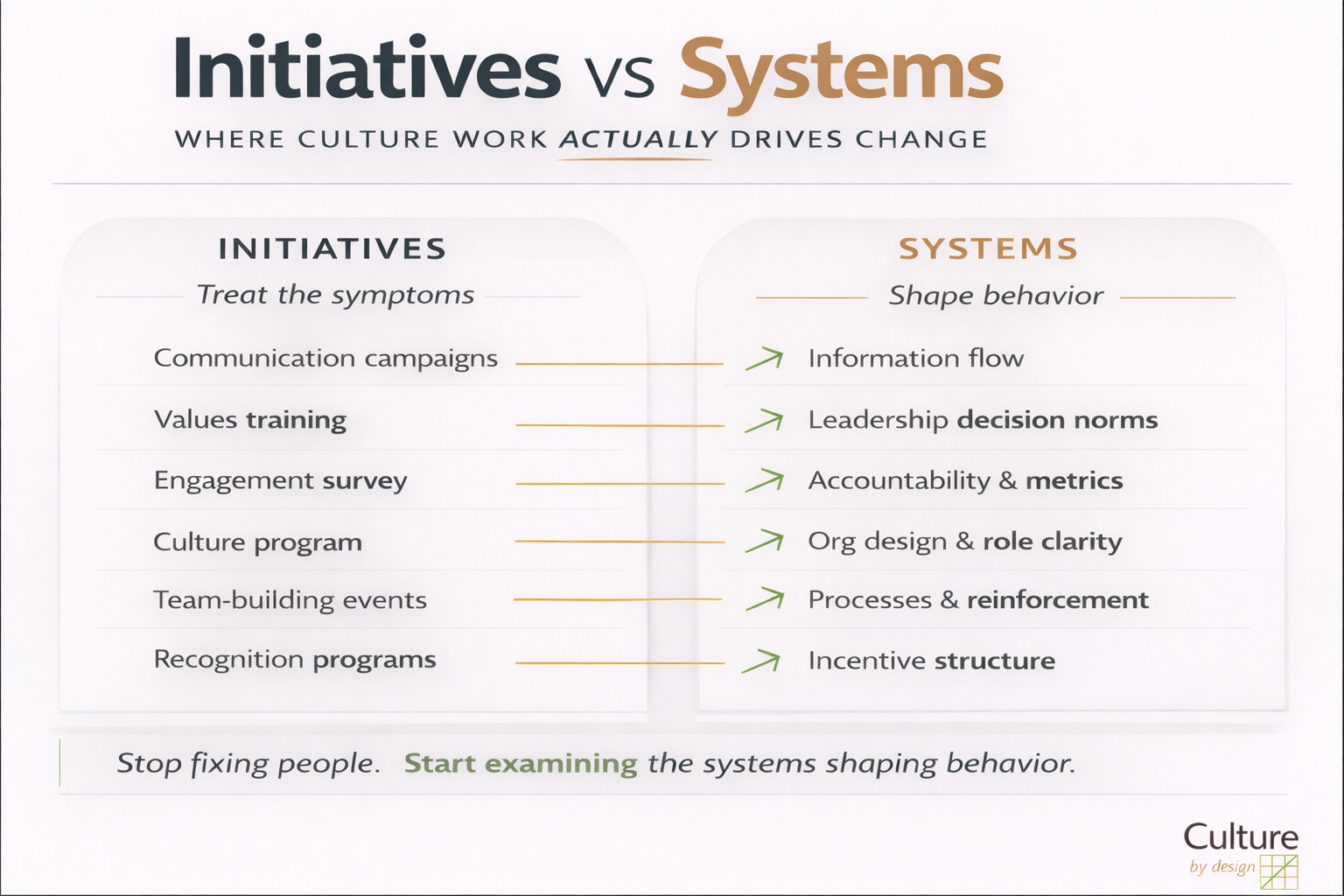 Most culture initiatives fail for one reason: Organizations try to fix behaviors before diagnosing the systems producing them.